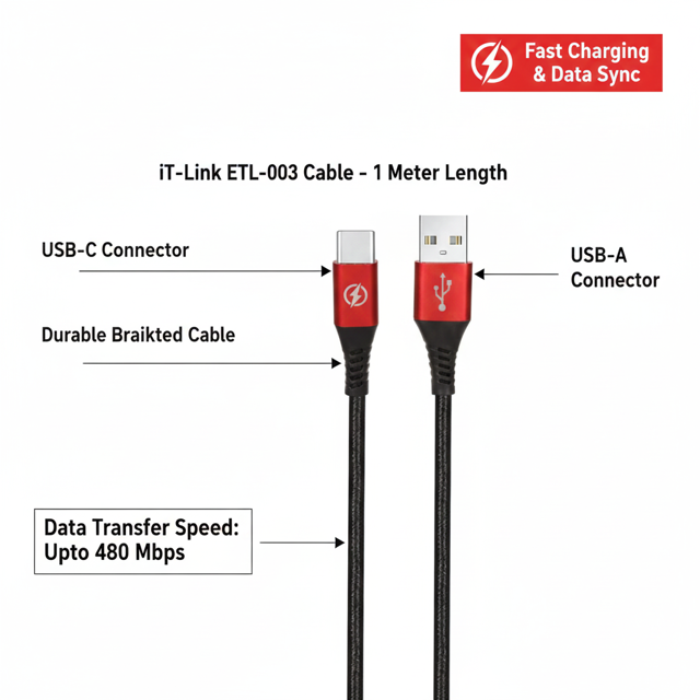 iT-Link USB to USB-C Converter Cable, Model ETL-003, 1 Meter Length